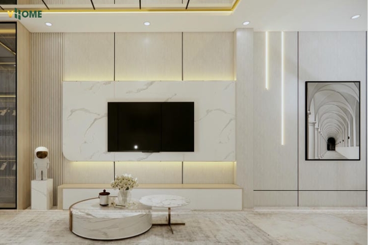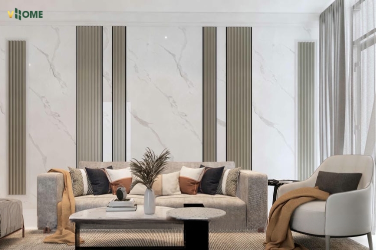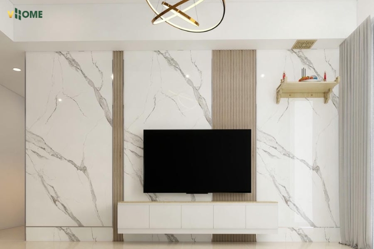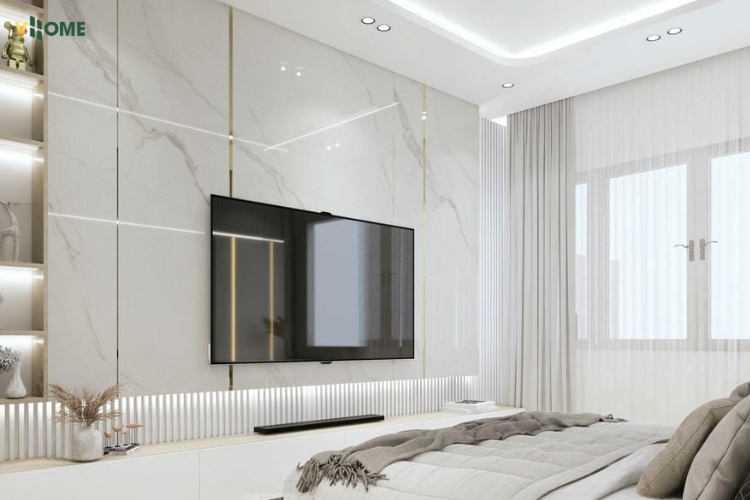 - Ốp tường sau sofa, sau TV hoặc sau giường ngủ bằng vân mây giúp: tạo mảng nhấn tinh tế, không bị rối mắt. Đồng thời tăng cảm giác sáng, thoáng, trẻ trung